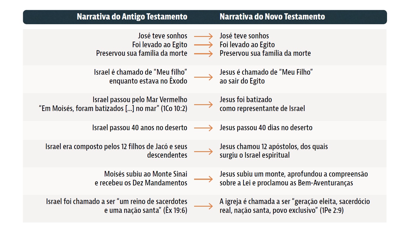 Como o Filho da aliança de Deus, a vida de Jesus representou uma “reencenação” integral da trajetória de Israel. Ele seguiu o mesmo percurso feito por Israel e, em cada momento em que a nação fracassou, Ele venceu. As semelhanças entre as duas histórias são claras e intencionais.