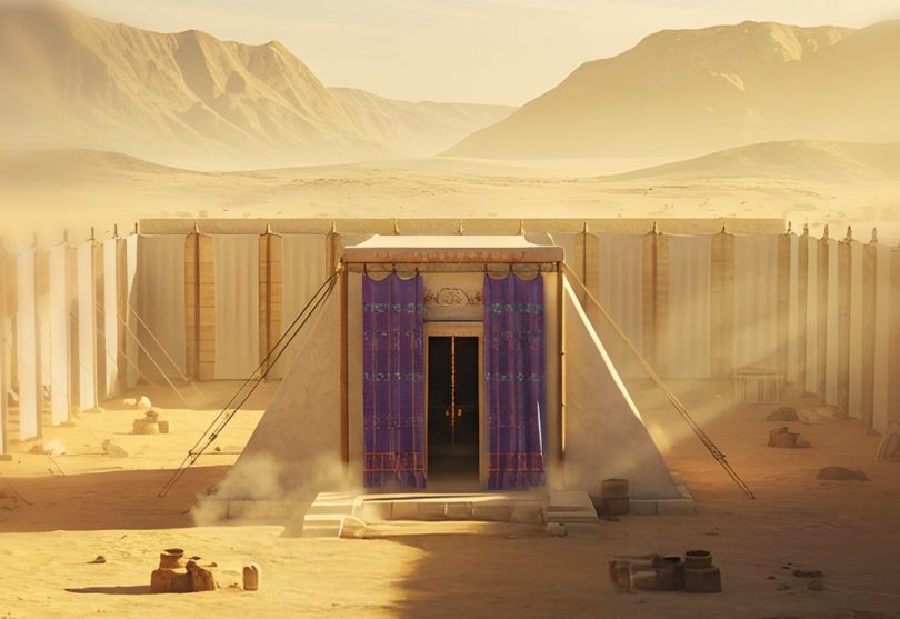 Fora do tabernáculo. Dentro do pátio, ao se olhar para o abrigo do tabernáculo, a mesma mensagem subconsciente transmitida pelo bordado teria sido reforçada. Assim, tanto o portão do pátio quanto o abrigo do tabernáculo comunicavam que a realeza estava além da cortina de entrada.