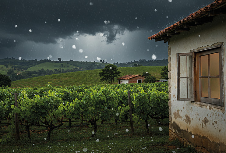 forte, e a chuva começava a cair. Parecia uma tempestade de verão: intensa e pesada. No entanto, naquele dia, o barulho era diferente, pelo menos para Enzo, que se levantou do sofá de forma rápida e correu até a janela. Foi nesse momento que, subitamente, escutou o pai gritar: “Não acredito! É granizo! Vou perder a safra!”