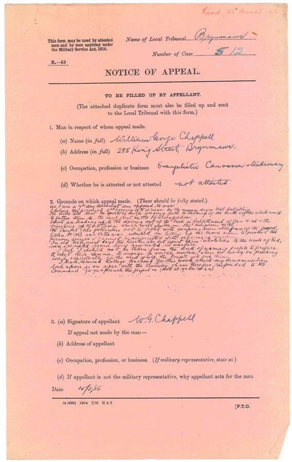 Documento mostra apelo feito por Chappell ao tribunal de Brynmawr para vender livros em vez de lutar. Crédito: acervo da Divisão Transeuropeia