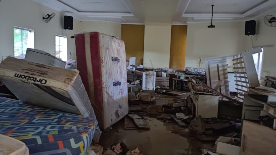 Parte interna da Igreja de Nova Alegria, povoado de Itamaraju. Água inundou o templo, que ainda assim serve de abrigo para guardar colchões de pessoas que ficaram desabrigadas. Foto: Divulgação