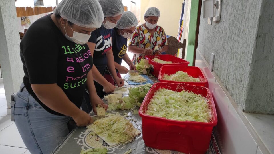 Voluntários preparam alimentos na Igreja Adventista de Fátima. Ação Solidária Adventista chegou a distribuir 700 refeições por dia na cidade. Foto: Jessé Boaventura