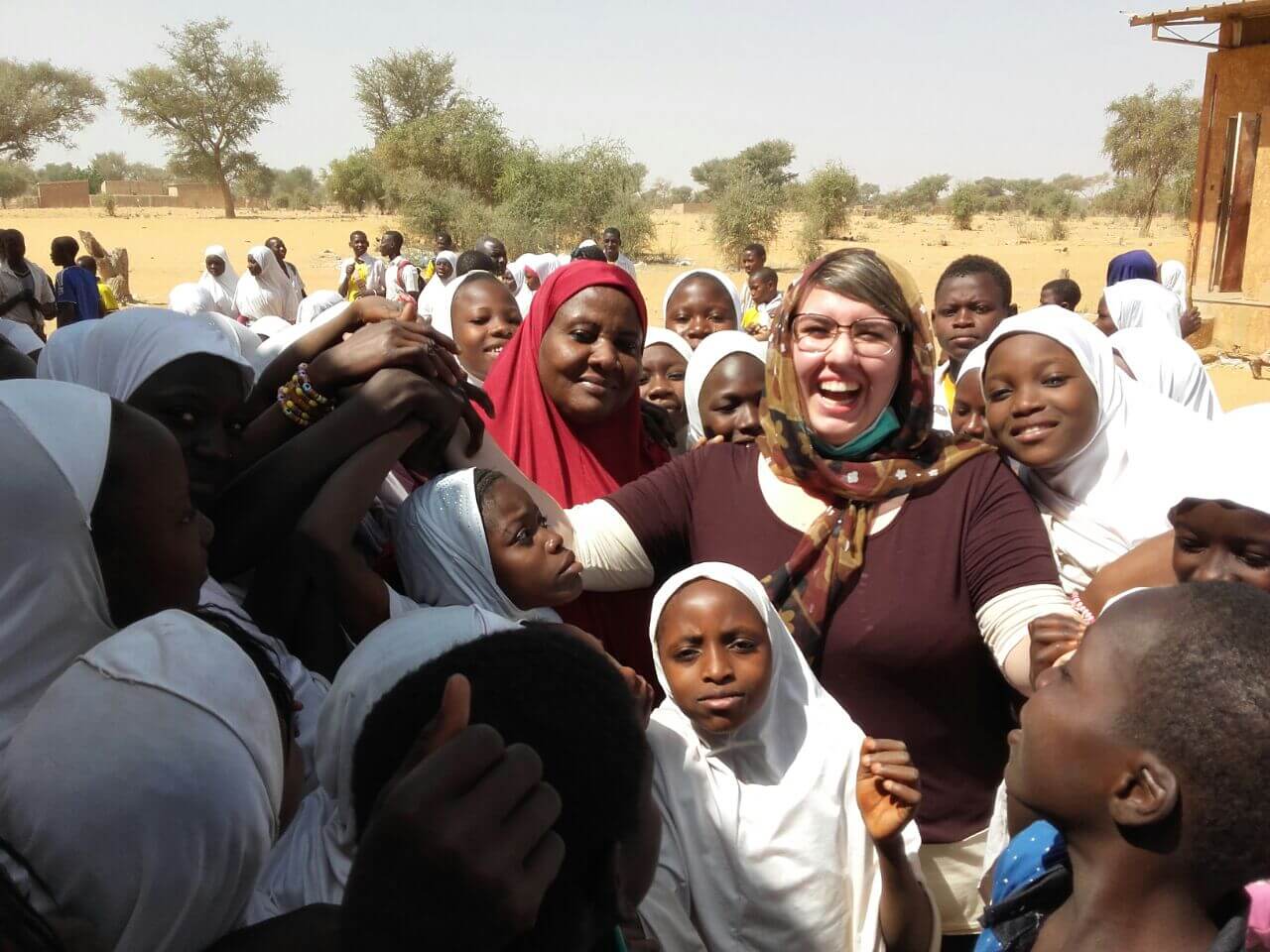 Keilla Piqueira (à dir.), uma das voluntárias brasileiras, em visita a uma escola no interior do país. A coordenadora pedagógica das unidades mantidas pela ADRA no Níger tem auxiliado na capacitação de professores e na formulação do plano de ensino das escolas