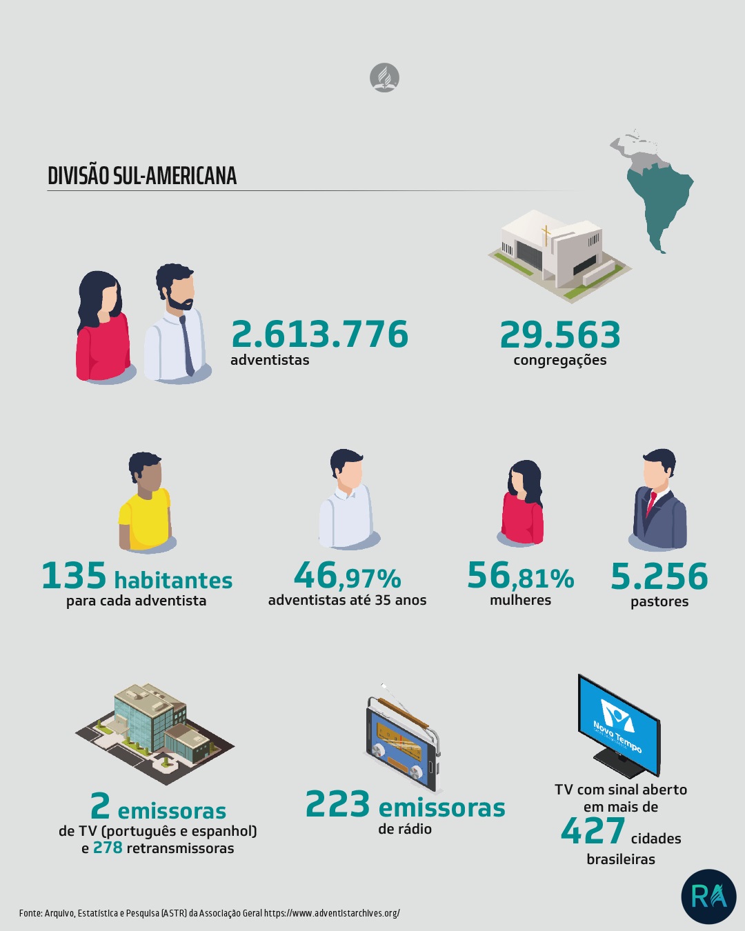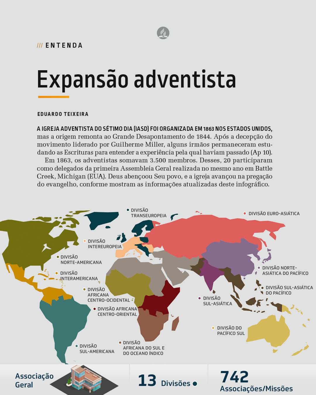 Em 1863, os adventistas somavam 3.500 membros. Desses, 20 participaram como delegados da primeira Assembleia Geral realizada no mesmo ano em Battle Creek, Michigan (EUA). Deus abençoou Seu povo, e a igreja avançou na pregação do evangelho, conforme mostram as informações atualizadas deste infográfico.