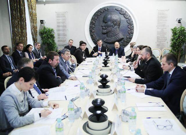 Líderes de diversas organizações religiosas, advogados, ativistas da área de direitos humanos, bem como membros da Presidência e do Ministério da Justiça da Federação Russa debatem lei que restringe o evangelismo no país.Crédito: Divisão Euroasiática