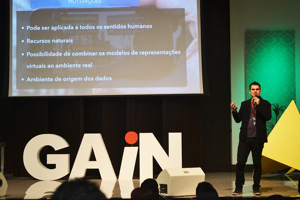 O profissional palestrou sobre a experiência da realidade aumentada a partir da utilização de vídeos em 360º. Por meio dessa tecnologia, o usuário tem a possibilidade de sentir-se inserido em outro local por meio de vídeos gravados em todos os ângulos.