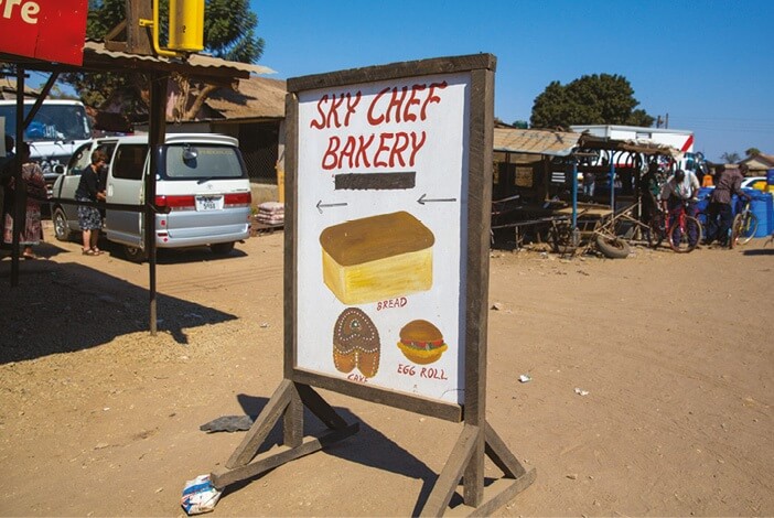 Propaganda da Padaria do Chefe do Céu, nas ruas de Livingstone, no Sul da Zâmbia. Foto: Dick Duerksen