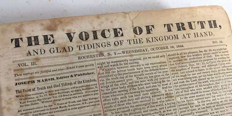 Quando o arquivista da La Sierra University, Tony Zbaraschuk, abriu o grande livro cinza-esverdeado com uma capa desgastada e páginas amareladas, ele não conseguia acreditar no que via. O que ele imaginou ser apenas um livro de contabilidade antigo, guardava uma raridade: diversas edições do boletim semanal The Voice of Truth (A Voz da Verdade), publicadas entre outubro de 1844 e junho de 1847 em Rochester, Nova York (EUA). O exemplar mais antigo encontrado no meio da obra data de 10 de outubro de 1844 e carrega um significado especial por ter sido impresso apenas 12 dias antes do chamado “Grande Desapontamento” (veja a foto).