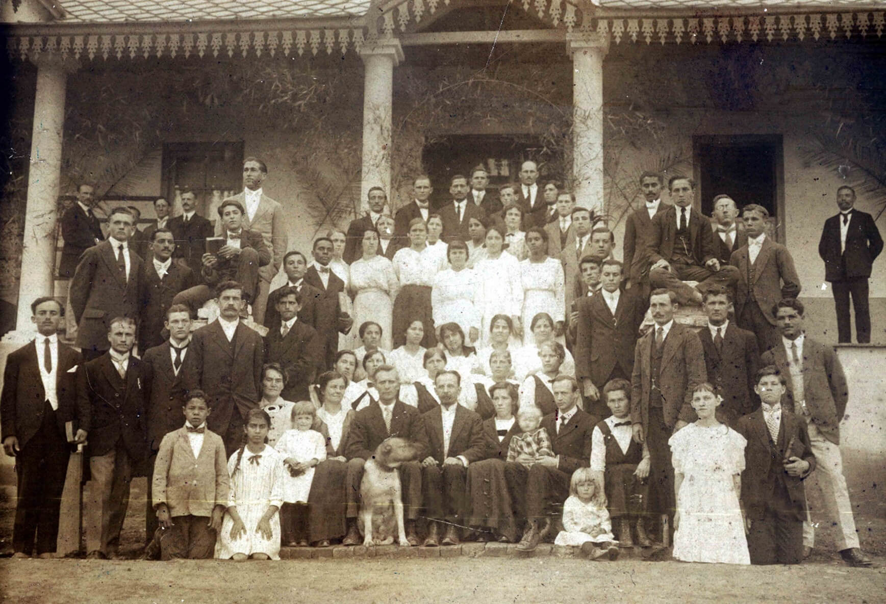 Na foto tirada em frente ao prédio do seminário, em 1917, Domingos também aparece do lado esquerdo, com gravata borboleta, próximo das alunas de branco, segurando o que parece ser um livro. O pastor Manoel Kümpel, que o evangelizou, é o primeiro da direita para a esquerda e foi professor do seminário entre 1916 e 1918. Crédito: curso de História do Unasp