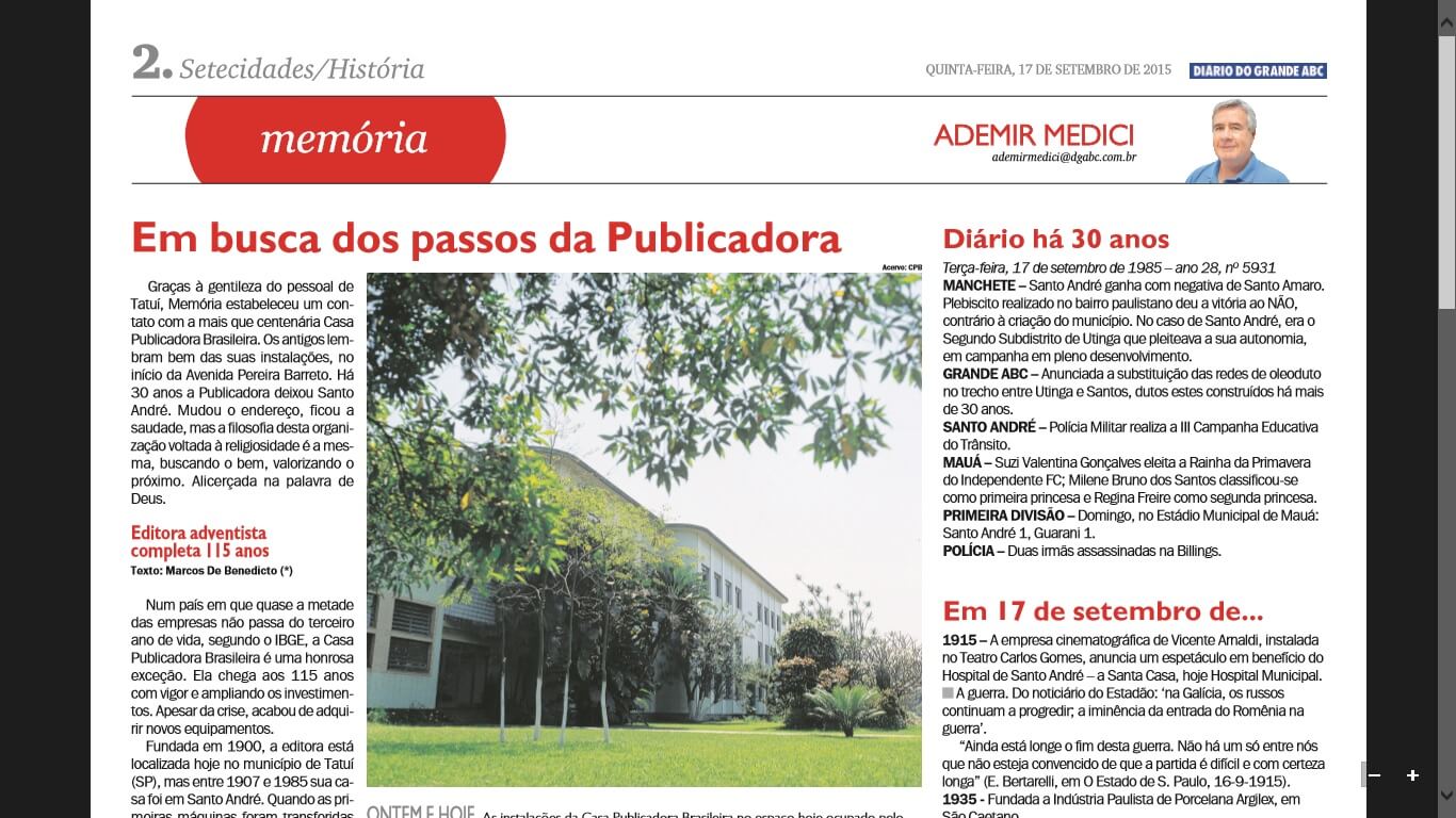 Diario do grande ABCNa edição desta quinta-feira, 17 de setembro, o jornal Diário do Grande ABC lembrou os 115 anos da Casa Publicadora Brasileira. O texto publicado na seção Memória também recordou o tempo em que a editora adventista funcionou na cidade de Santo André e a mudança da instituição para Tatuí, no interior do Estado.
