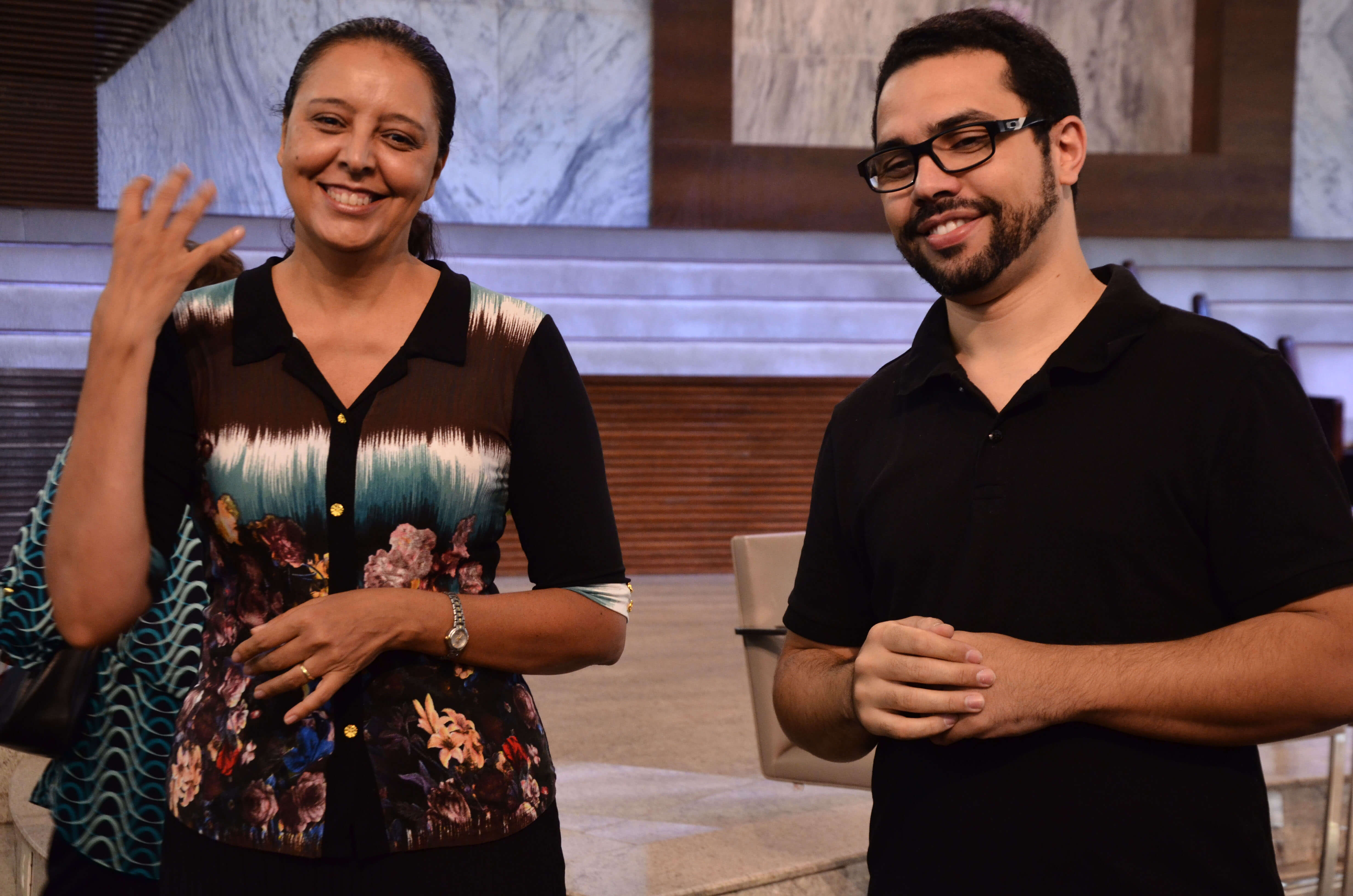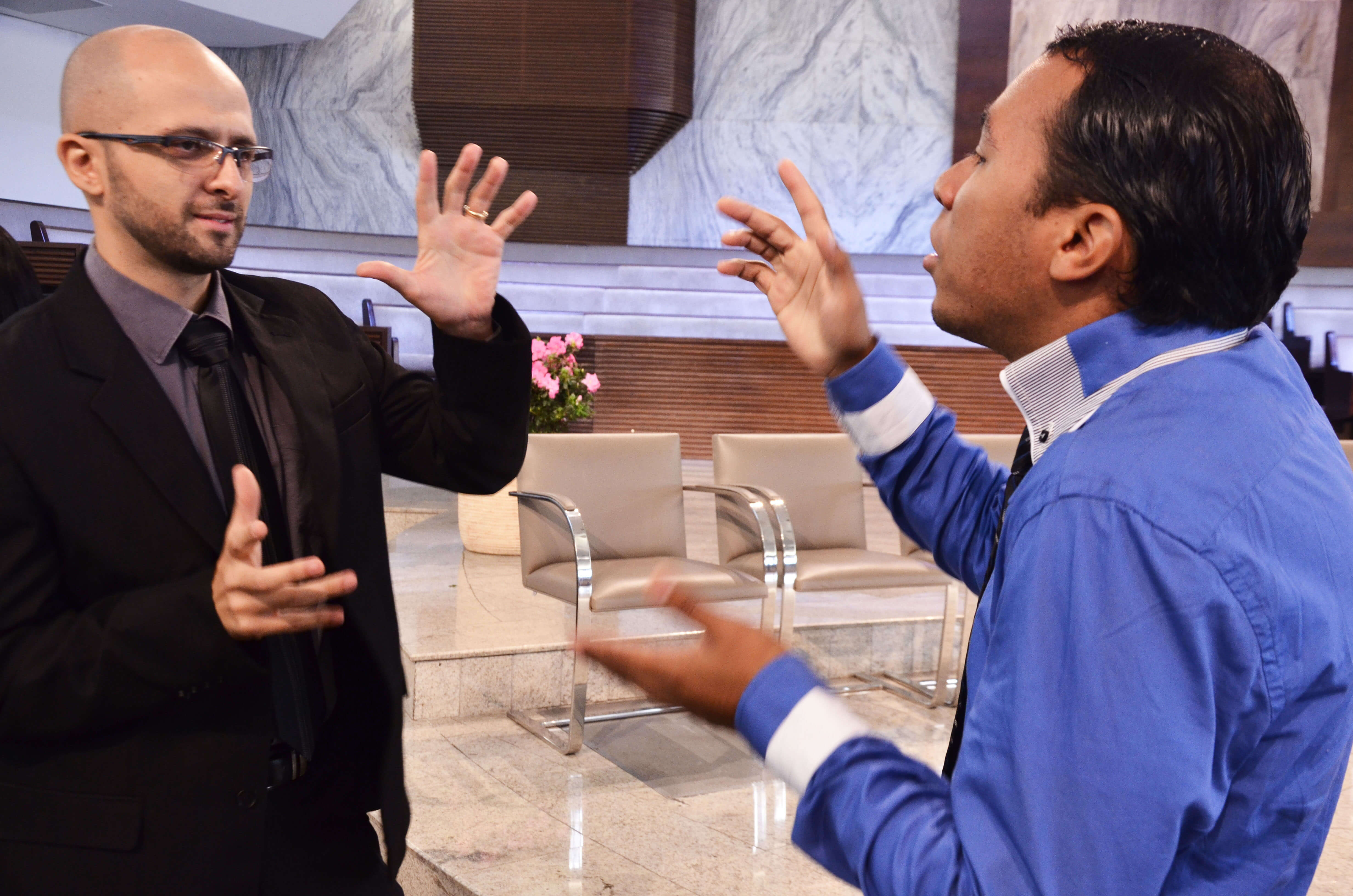 O visitante Thiago dos Santos (à direita) com Elias Gonçalves Júnior, intérprete e colaborador do ministério dos surdos. Foto: Danúbia França