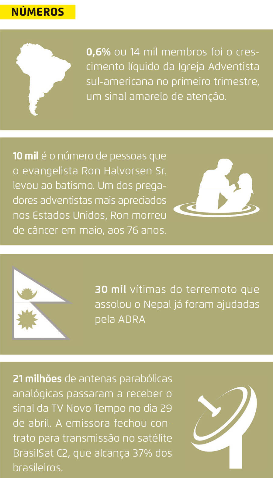 Por causa do terremoto de 7,8 graus na escala Richter que assolou o Nepal, no dia 25 de abril, uma avalanche passou a 50 metros de Ernesto Olivares Miranda, de 52 anos. O adventista chileno estava numa base de acampamento a 5,3 mil metros de altitude quando o tremor sacudiu a montanha mais alta do mundo. “Nesse momento, roguei a Deus que me permitisse abraçar uma vez mais minha família e lembrei- me da promessa do Salmo 91”, conta o alpinista, que se atirou no gelo para preservar a vida. Vinte pessoas morreram na avalanche e 8 mil no terremoto.
