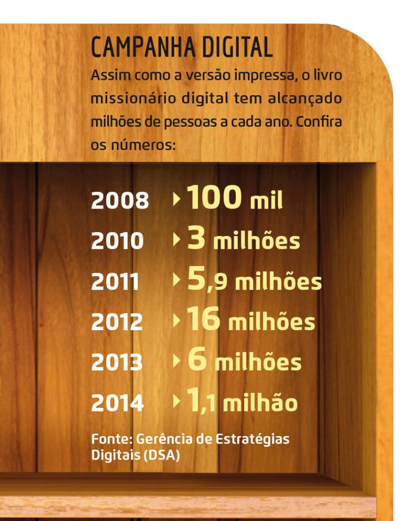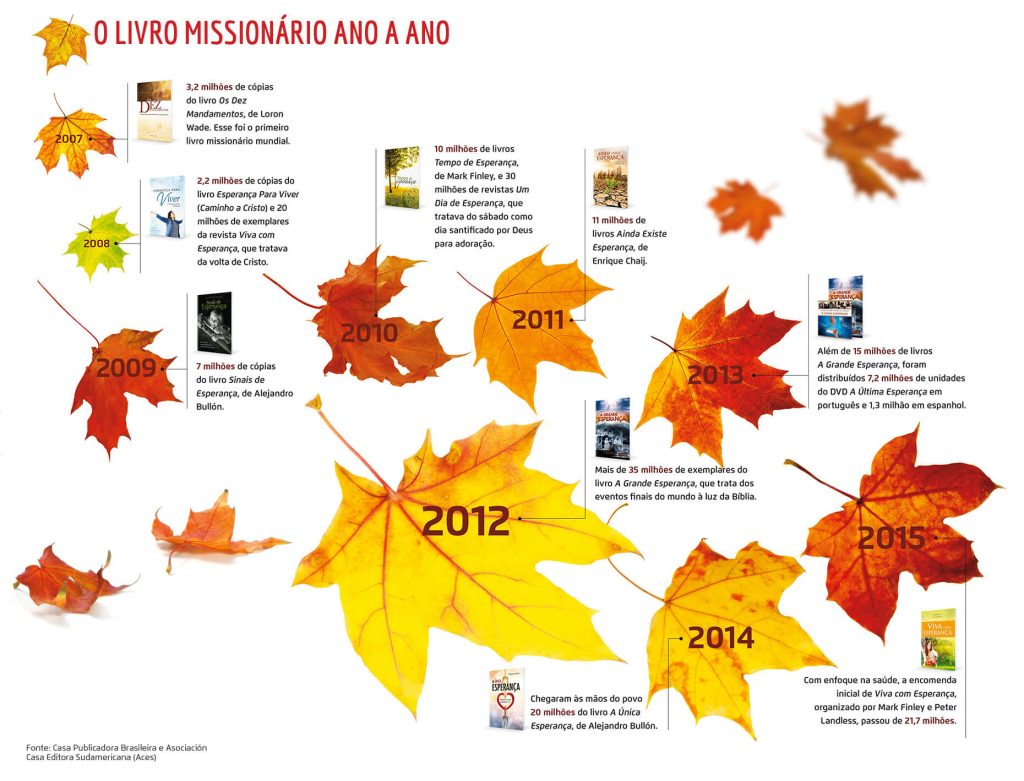O alcance do livro missionário é, portanto, maior do que se pode imaginar. Vai além das fronteiras do tradicional formato impresso. Nos escritos de Ellen White, a distribuição de literatura denominacional é comparada a folhas de outono espalhadas por vários lugares. De 2015 em diante, essas folhas devem se espalhar com uma rapidez impressionante e dar nova vida e perspectivas a muita gente ainda. [Reportagem: Felipe Lemos/Com colaboração de Márcio Tonetti]