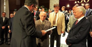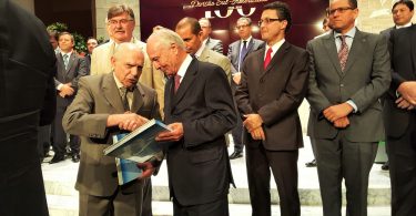Roberto Gullón (à esquerda) e Rubens Lessa (à direita): autor e editor do livro “Uma semente de esperança” trocam cumprimentos durante o lançamento da obra. Foto: Márcio Tonetti