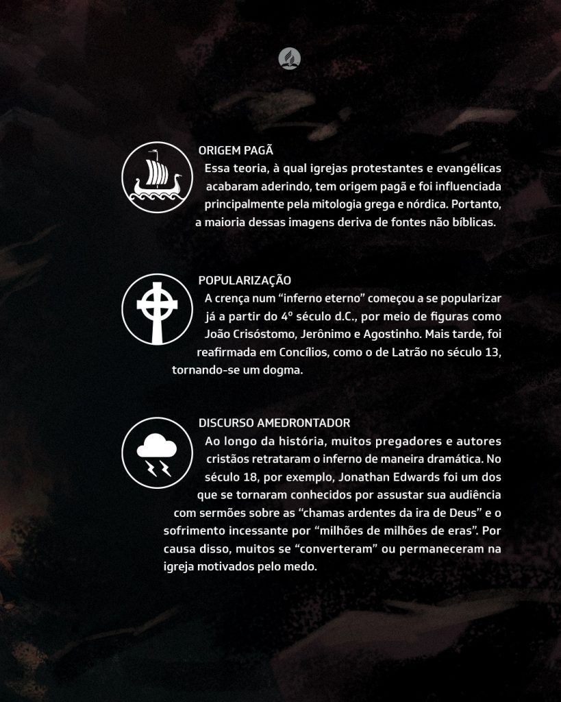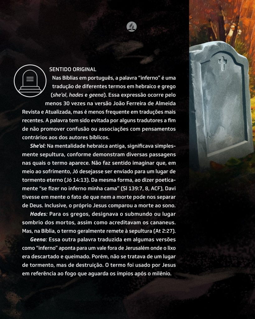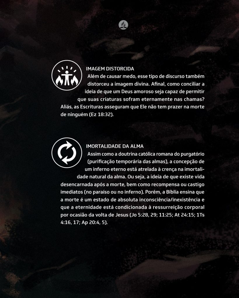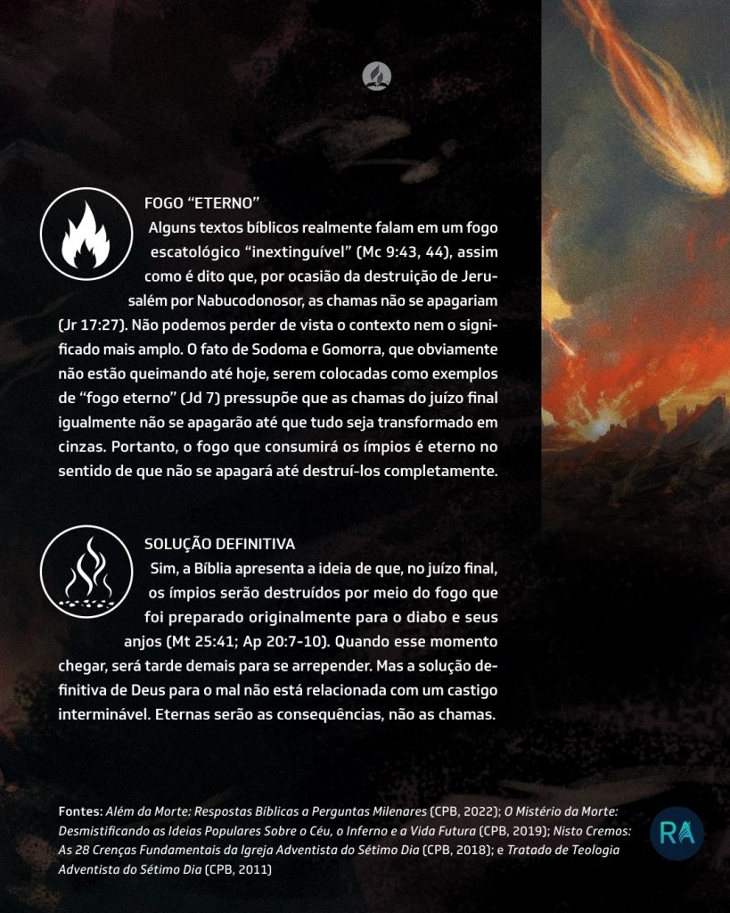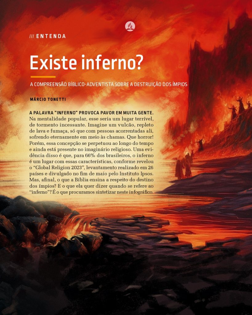 A palavra “inferno” provoca pavor em muita gente. Na mentalidade popular, esse seria um lugar terrível, de tormento incessante. Imagine um vulcão, repleto de lava e fumaça, só que com pessoas acorrentadas ali, sofrendo eternamente em meio às chamas. Que horror! Porém, essa concepção se perpetuou ao longo do tempo e ainda está presente no imaginário religioso. Uma evidência disso é que para 66% dos brasileiros, o inferno é um lugar com essas características, conforme revelou o “Global Religion 2023”, levantamento realizado em 26 países e divulgado no fim de maio pelo Instituto Ipsos. Mas, afinal, o que a Bíblia ensina a respeito do destino dos ímpios? E o que ela quer dizer quando se refere ao “inferno”? É o que procuramos sintetizar neste infográfico.