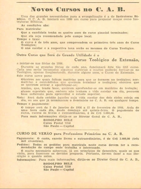 Entre as iniciativas que também marcaram essa época podem ser citadas a implantação do “Curso Teológico de Extensão”. Conforme noticiou a Revista Adventista na edição de dezembro de 1955 (p. 24), o curso promovido durante as férias de verão permitia que obreiros que não haviam cursado Teologia, ou alunos que não haviam conseguido completar o curso, se formassem em poucos anos, dedicando 45 dias de estudo presencial por ano.
