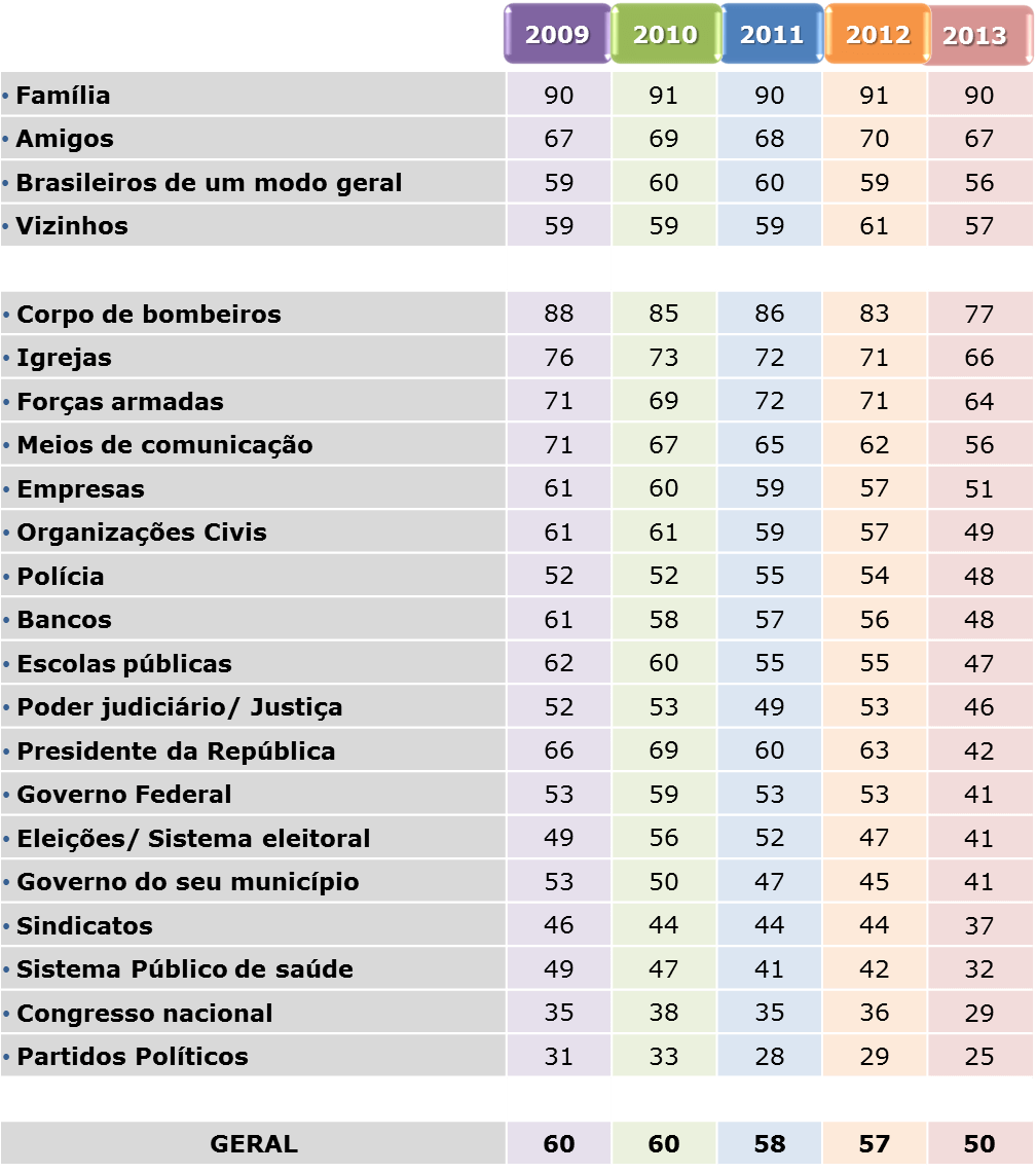 O ICS mede a confiança dos brasileiros nas instituições, pessoas e grupos sociais. Fonte: Ibope