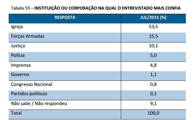 As demais avaliadas pela pesquisa aparecem bem atrás. As “Forças Armadas” ocupam a 2ª posição no ranking, com 15,5%. A “Justiça”, com 10,1%, vem em terceiro lugar. A avaliação foi ainda pior no caso da “Polícia” (5%), da “Imprensa” (4,8%), do “Governo” (1,1%), do “Congresso Nacional” (0,8%) e dos “Partidos políticos” (0,1%). Do total, 9,1% disseram que não sabiam ou não responderam.