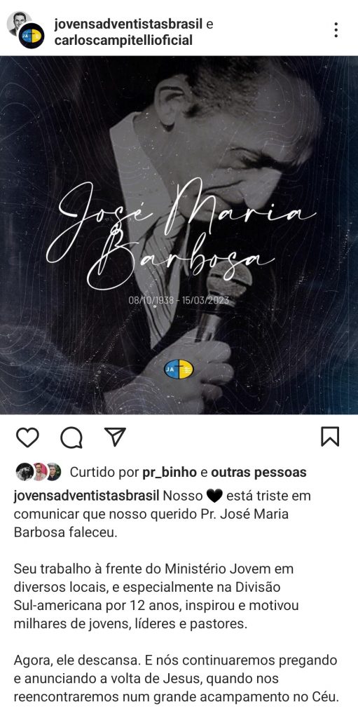 Na semana em que será lembrado o Dia Mundial do Jovem Adventista (18 de março), a igreja se despede de um líder que inspirou uma geração. Amado e querido por todos, o pastor José Maria Barbosa marcou a juventude adventista sul-americana. Ele faleceu nesta quarta-feira (15), aos 84 anos (8/10/1938-15/3/2023), em Campinas (SP), vítima de insuficiência renal. Deixa as três filhas (Cristiane, Daniele e Jussara), o genro, Arnaldo, e os três netos (Ana Elisa, Giulia e Benjamin).