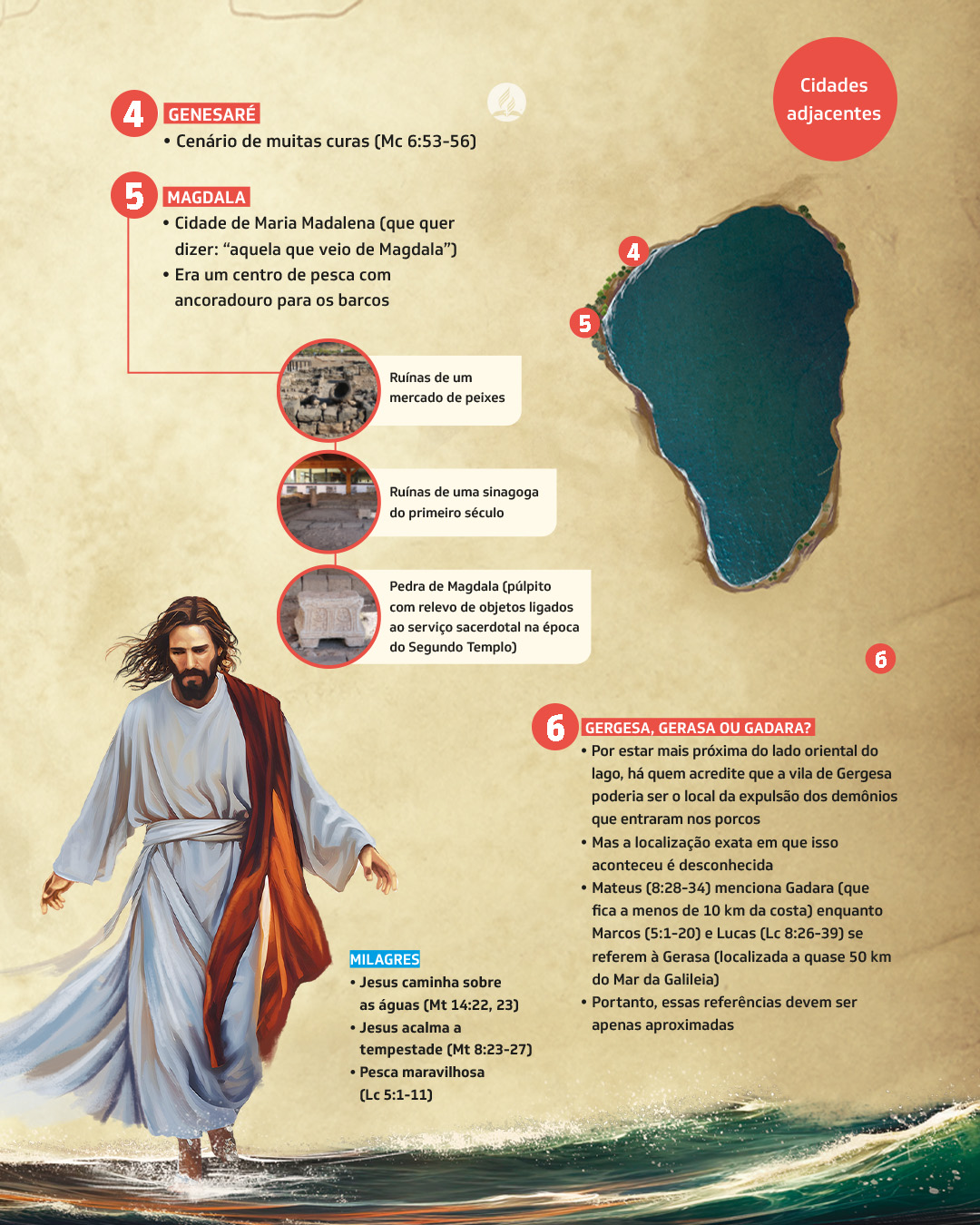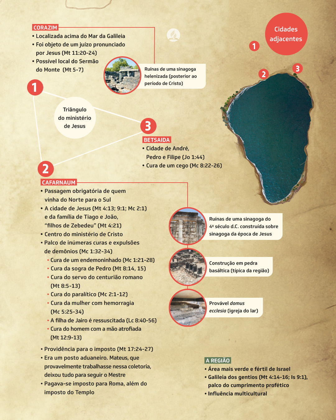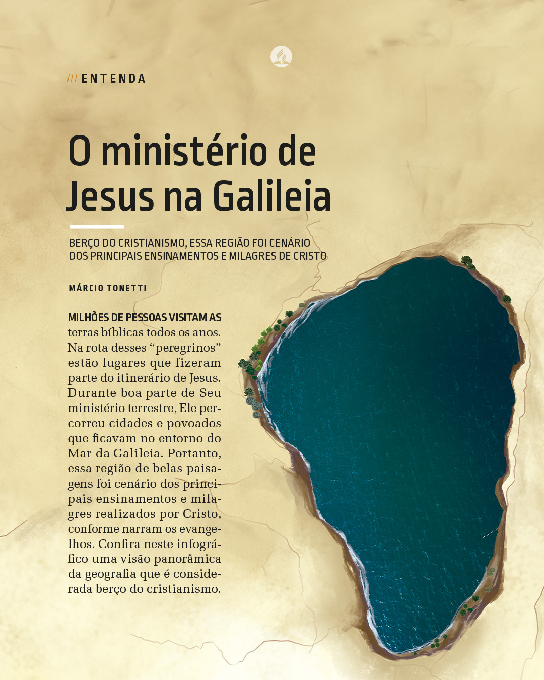 Milhões de pessoas visitam as terras bíblicas todos os anos. Na rota desses “peregrinos” estão lugares que fizeram parte do itinerário de Jesus. Durante boa parte de Seu ministério terrestre, Ele percorreu cidades e povoados que ficavam no entorno do Mar da Galileia. Portanto, essa região de belas paisagens foi cenário dos principais ensinamentos e milagres realizados por Cristo, conforme narram os evangelhos. Confira neste infográfico uma visão panorâmica da geografia que é considerada berço do cristianismo.
