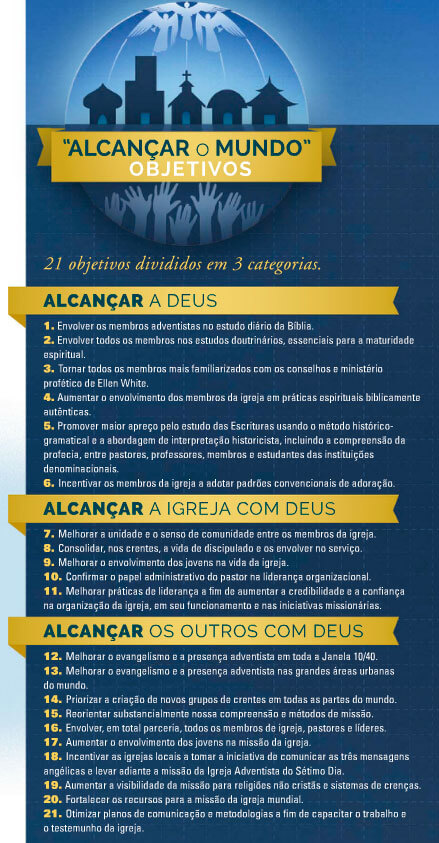 Os objetivos principais do “Reach the World” se resumem em três categorias: (1) “Alcançar a Deus”, (2) “Alcançar a igreja com Deus” e (3) “Alcançar os outros com Deus” (Veja no quadro abaixo a lista de objetivos específicos em cada uma dessas áreas). Em outras palavras, a igreja mundial ajustará o foco visando a fortalecer em sua membresia a comunhão, o relacionamento e a missão.
