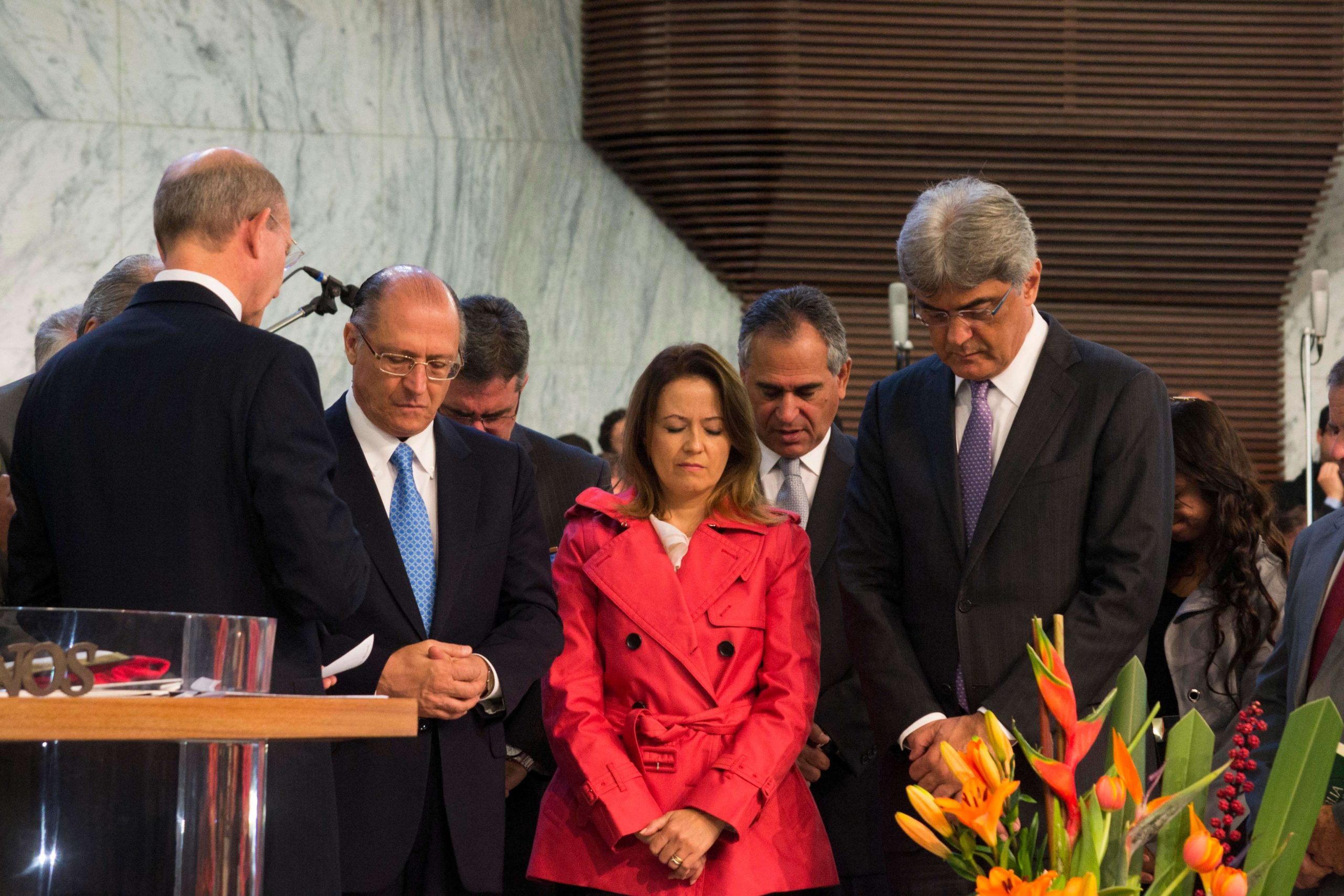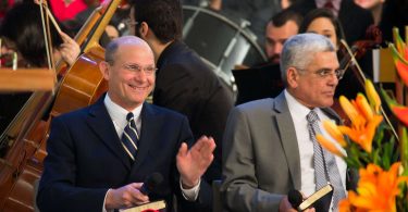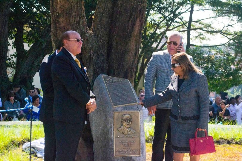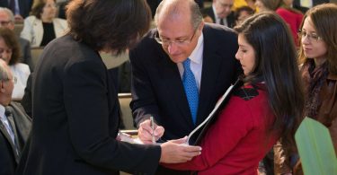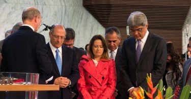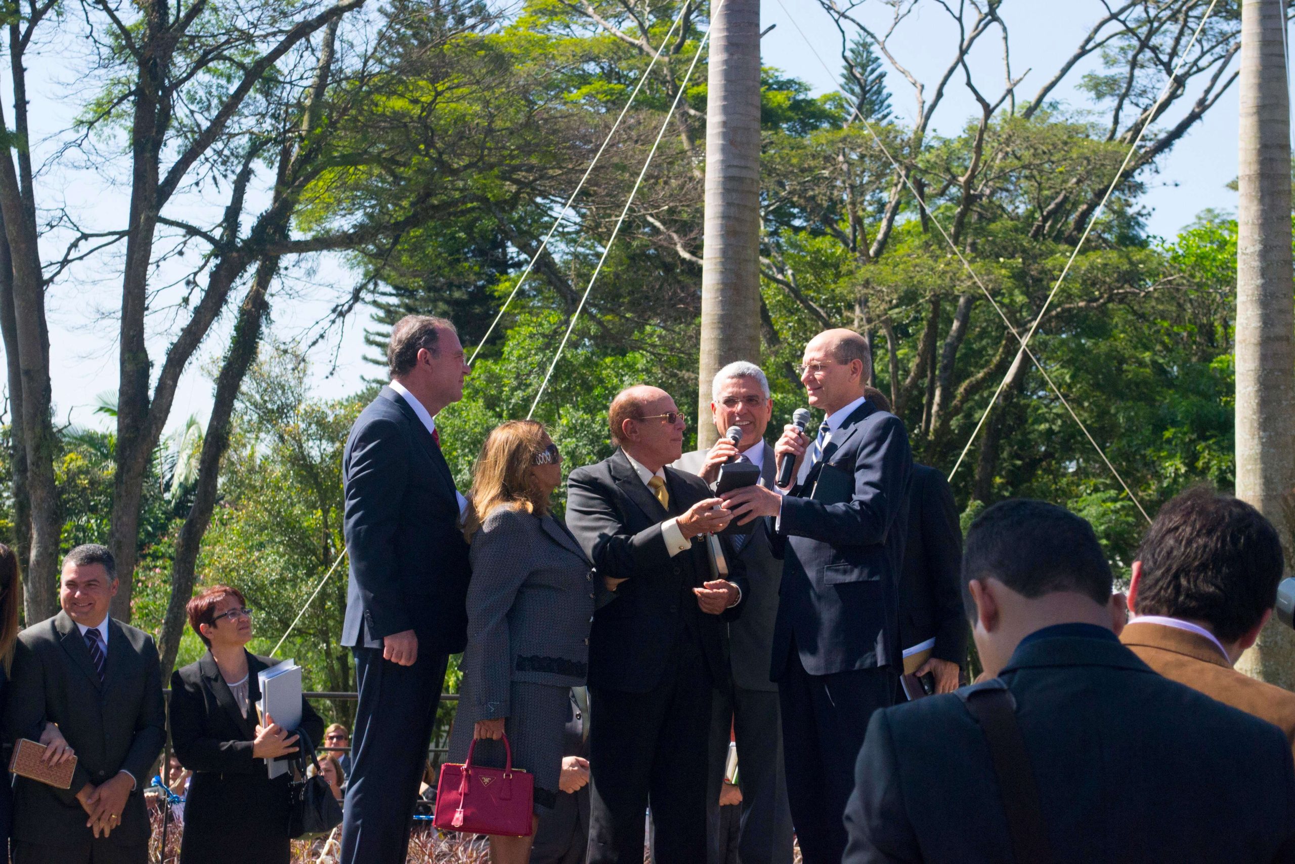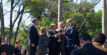 O pastor Helio Carnassale, diretor-geral do Unasp, campus SP, e o presidente mundial da Igreja Adventista, pastor Ted Wilson, presenteiam o governador de São Paulo com o “Marco do Centenário”. Foto: Márcio Tonetti