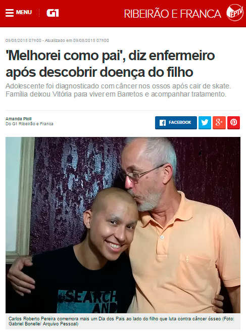 A história do jovem adventista Gabriel Pereira, de 17 anos, e do pai dele, Carlos Roberto, foi notícia no portal G1 nesta semana. Na data em que foi comemorado o dia dos pais, 9 de agosto, a reportagem mostrou como eles encararam a vida depois que Gabriel foi diagnosticado com um tipo de câncer ósseo há dois anos. Pela necessidade de acompanhamento médico constante para o filho, a família de Vitória (ES) precisou se mudar para Barretos (SP), onde Gabriel recebe tratamento no Hospital de Câncer e conta com o apoio da Centro Adventista de Apoio à Família (CAAF). [Com informações do G1 e da ASN]