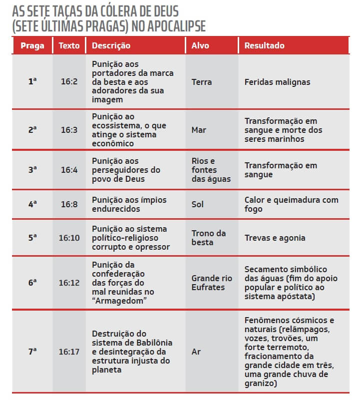 Teoricamente, as pragas iniciais do Apocalipse poderiam ser redentivas, caso alguém queira enfatizar um paralelo mais próximo com as pragas do Egito, em que o faraó endureceu o coração, mas tinha chance de mudar de ideia. Afinal, a narrativa dessa guerra entre Deus e os deuses do Egito (Êx 12:12) indica que, se o monarca mudasse sua obstinação, Deus mudaria o roteiro da punição (4:8, 9; 8:8-12, 28-31; 9:27-29; 10:16-19). Além disso, a linguagem da quarta e da quinta praga do Apocalipse (16:8-11) sugere que era de se esperar que as pessoas se arrependessem, mas elas continuam blasfemando o nome de Deus.