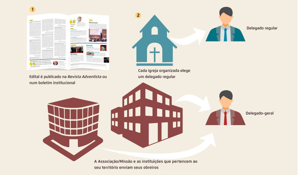 Existem dois tipos: regulares e gerais. Cada igreja organizada elege e credencia apenas um delegado regular. As igrejas grandes podem enviar mais de um representante, desde que se enquadrem na proporcionalidade indicada no estatuto da Associação. No caso dos grupos, seus delegados são indicados pela Comissão Diretiva da Associação. O cálculo de proporcionalidade é feito com base no número de membros existentes em 31 de dezembro do ano anterior. Por sua vez, os delegados-gerais são os membros da Comissão Diretiva da Associação e seus obreiros das diversas áreas de atuação, além de representantes de outros níveis administrativos da igreja. Detalhe: o número de delegados-gerais das organizações superiores não pode exceder a 10% dos delegados regulares.