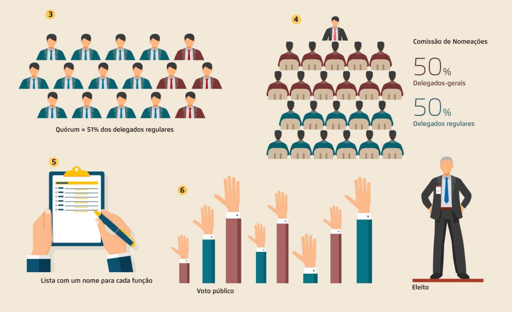 A Comissão de Nomeações proporá à assembleia uma lista com apenas um nome para cada função eletiva. Esse relatório poderá ser feito de modo parcial, com intervalos, ou de uma só vez. A assembleia debaterá acerca dos nomes recomendados e elegerá os novos líderes por maioria simples dos votos.