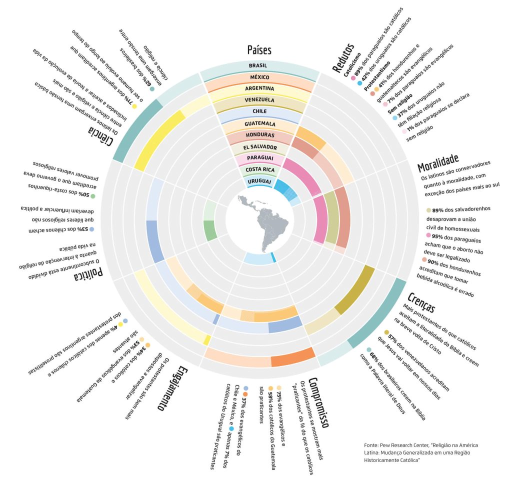 Nosso subcontinente é um terreno fértil para a religião, mas nas últimas décadas tem testemunhado mudanças importantes no modo pelo qual sua população expressa a fé. Um estudo feito com 30 mil pessoas de 18 países e publicado recentemente pelo Pew Research Center apresenta números dessa transformação. Apesar de a América Latina abrigar 40%dos católicos do mundo (425 milhões), a igreja romana começou a perder sua hegemonia na região a partir da década de 1970. Hoje, 69% dos adultos se identificam como católicos. A perda tem que ver com a idade (a maioria se converteu antes dos 25 anos) e com a migração (muitos trocaram de religião depois que se mudaram da cidade natal). Outra tendência é o crescimento dos evangélicos (19%) e sem religião (8%). Entender esse panorama é fundamental para cooperar com a missão adventista por estas bandas.